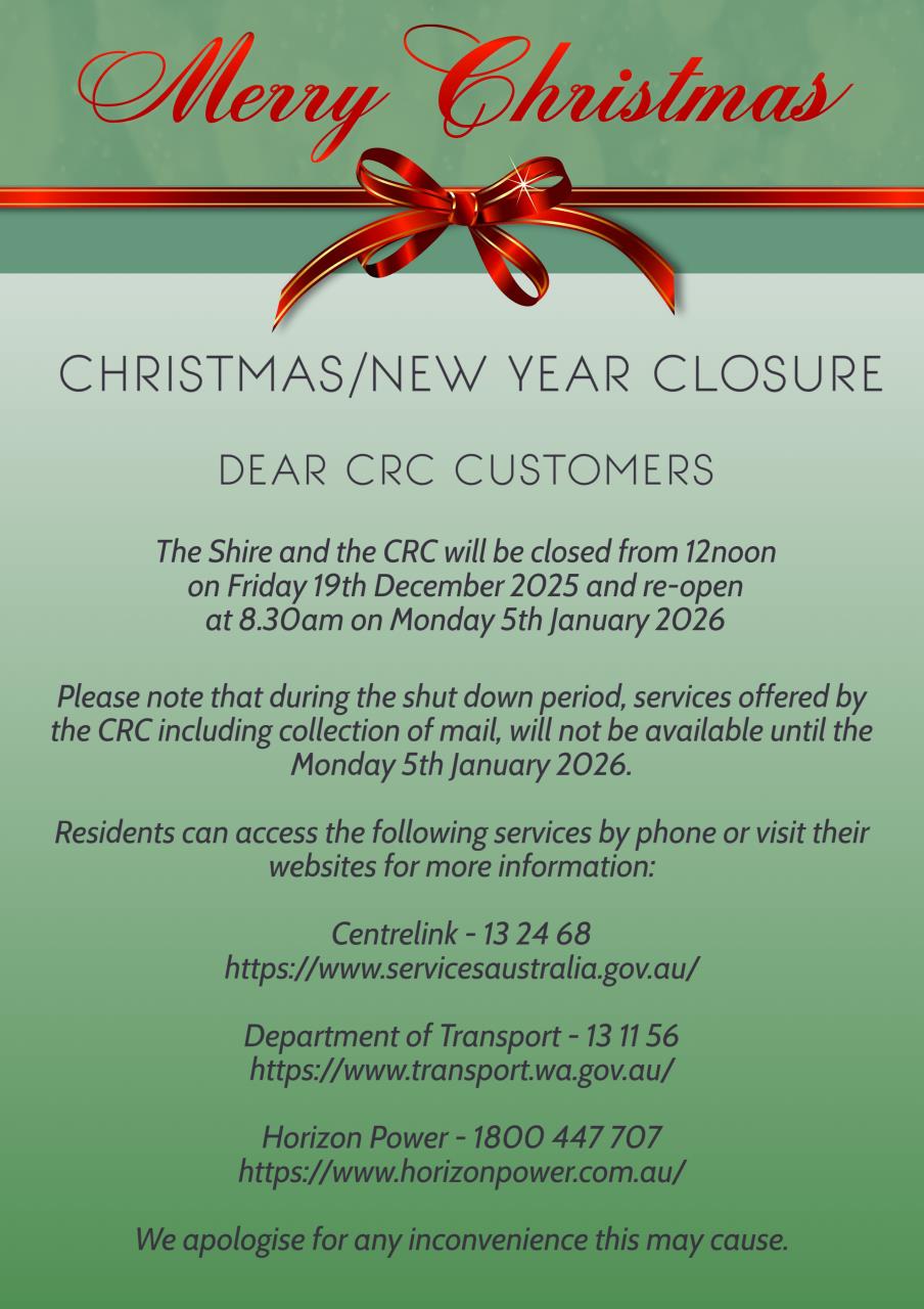 We would like to advise that the Shire and the CRC will be closed from 12 noon on the 19th of December 2025 to the 5th of January 2026.